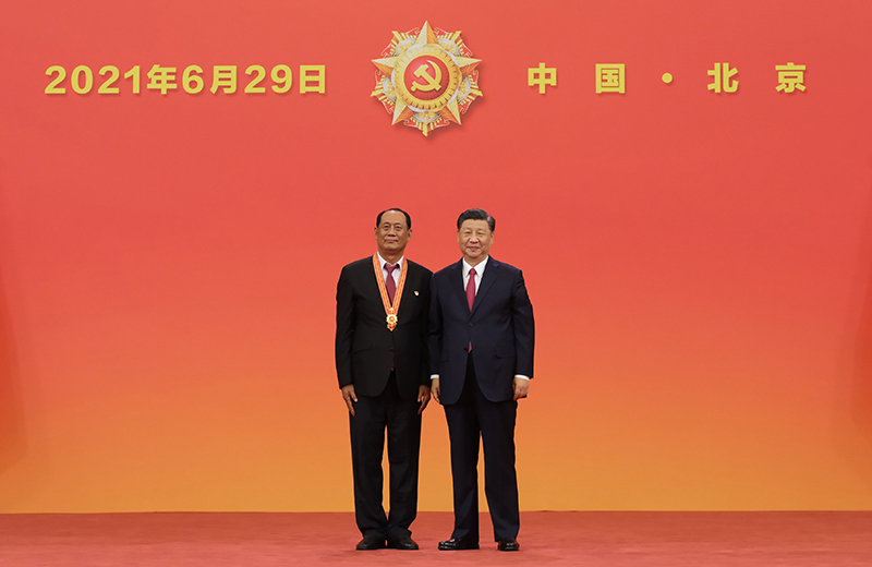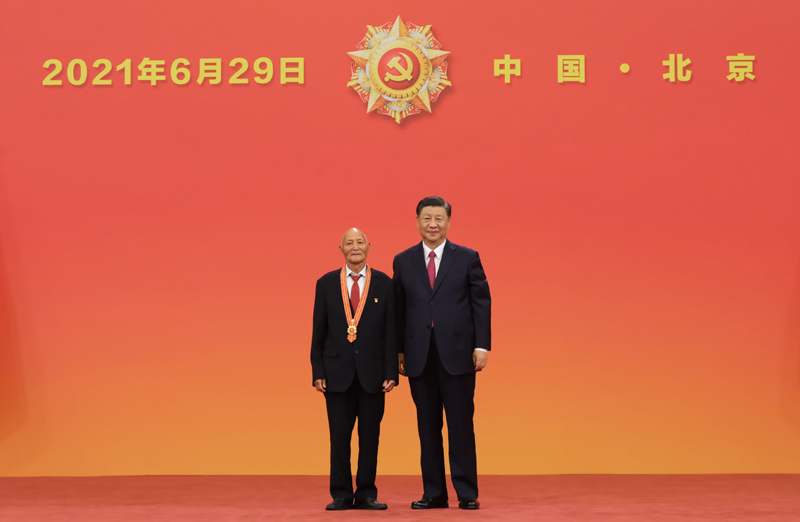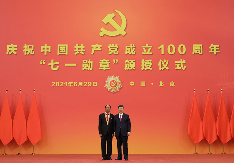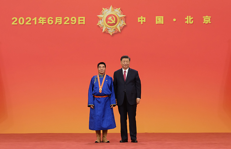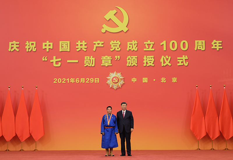 6月29日,慶祝中國共產(chǎn)黨成立100周年“七一勛章”頒授儀式在北京人民大會(huì)堂金色大廳隆重舉行。中共中央總書記、國家主席、中央軍委主席習(xí)近平向“七一勛章”獲得者廷·巴特爾頒授勛章。新華社記者 李學(xué)仁 攝