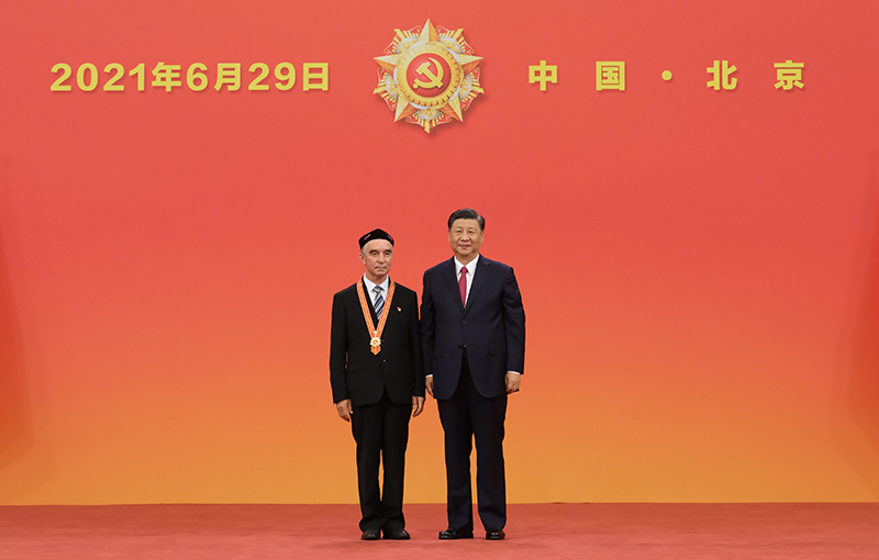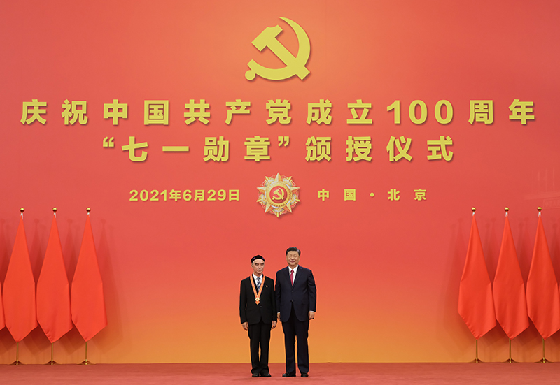 6月29日,慶祝中國共產(chǎn)黨成立100周年“七一勛章”頒授儀式在北京人民大會(huì)堂金色大廳隆重舉行。中共中央總書記、國家主席、中央軍委主席習(xí)近平向“七一勛章”獲得者買買提江·吾買爾頒授勛章。新華社記者 李學(xué)仁 攝