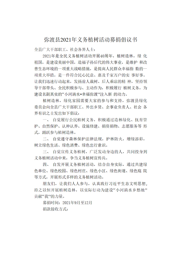 大理市彌渡縣2021年義務植樹活動募捐倡議書