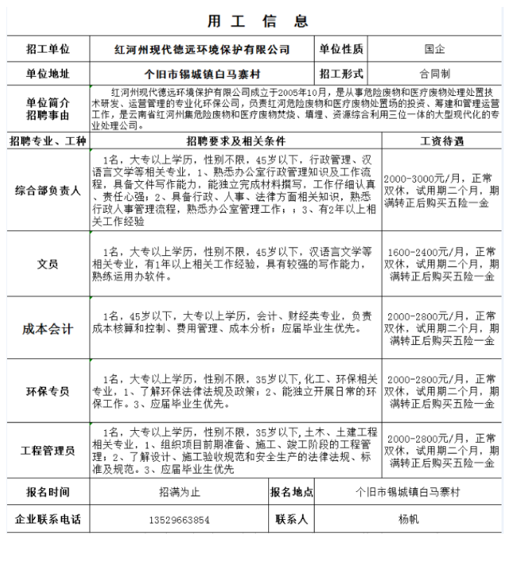 紅河州現(xiàn)代德遠(yuǎn)環(huán)境保護有限公司招聘信息